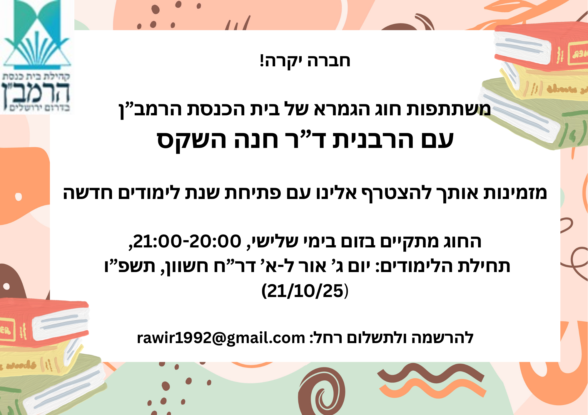 יום א׳ | 20:00 | שיעור גמרא לנשים | הרבנית חנה השקס |