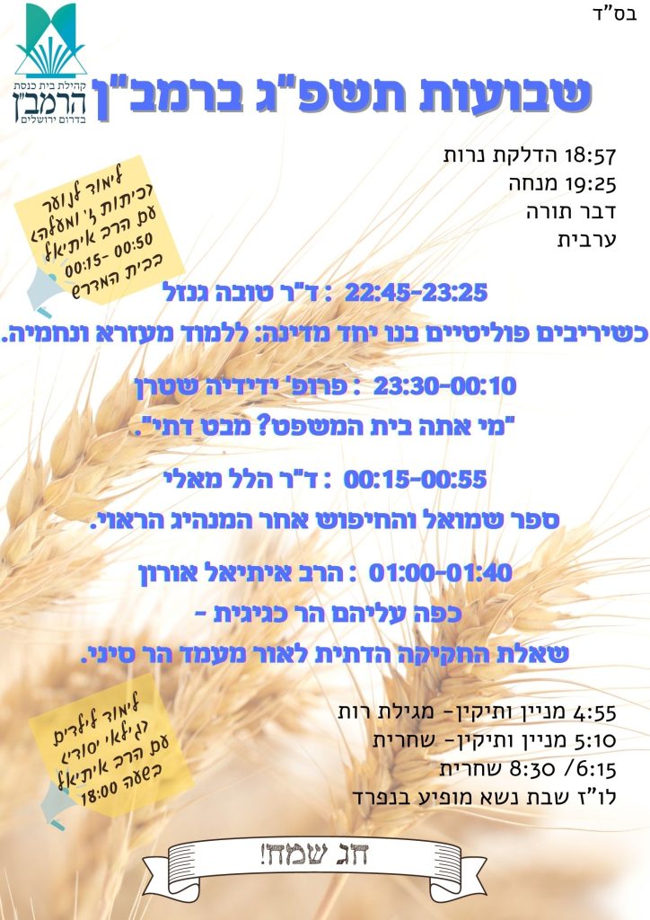 מזל טוב לחברינו חנה ושלמה צוויטר לרגל הולדת הנינה, נכדה ליפה ואלי סטורץ ובת לליאורה והלל סטורץ. לחברינו הרב פנחס ורבקה קאהן לרגל הולדת הנין נתן חיים בן אדרת ומשה גדמו. "לא ניתנו שבתות וימים טובים לישראל אלא לעסוק בהם בדברי תורה" שיעורים השבוע : הרב איתיאל ידבר בסוף תפילת המניין הראשון. לאחר מוסף […]