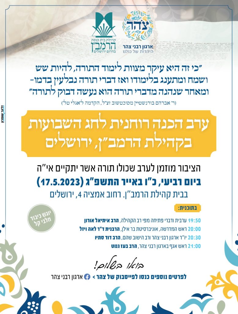 קהילת הרמב"ן משתתפת בצערה של חברתנו ריימה שטרנהיים בפטירתו של חתנה, דיויד בלאק ז"ל, בעלה של בתה גליה. "לא ניתנו שבתות וימים טובים לישראל אלא לעסוק בהם בדברי תורה" שיעורים השבוע : לאחר מוסף יערך לימוד משפחות. שיעור שבת אחה"צ מאת הרב איתיאל- סדרת שיעורים "מלך בשר ודם"- עיון בפרקי דוד. יום שני שיעור […]