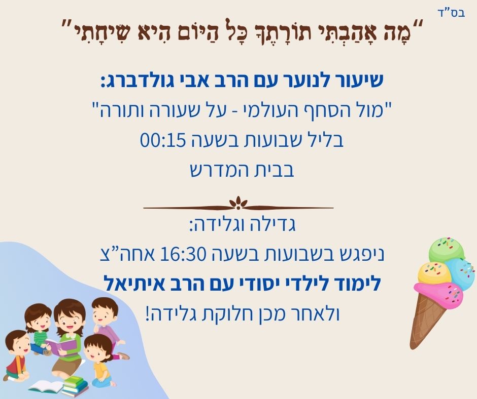 מזל טוב לחברנו הרב מתיתיהו ויהודית קלרק לרגל הולדת הנינה- תחיה הללי. שיעורים השבוע: הערב בשעה 20:15 יתקיים שיעורו של הרב איתיאל על פרשת השבוע. שבת: בשבת אחה"צ יתקיים שיעורו של הרב איתיאל על ספר שופטים. בשבוע הבא: ◊ שיעור הלכה יום שני בשעה 20:15◊ שיעור גמרא יום שלישי בשעה 7:45◊ שיעור פרשת שבוע יום […]